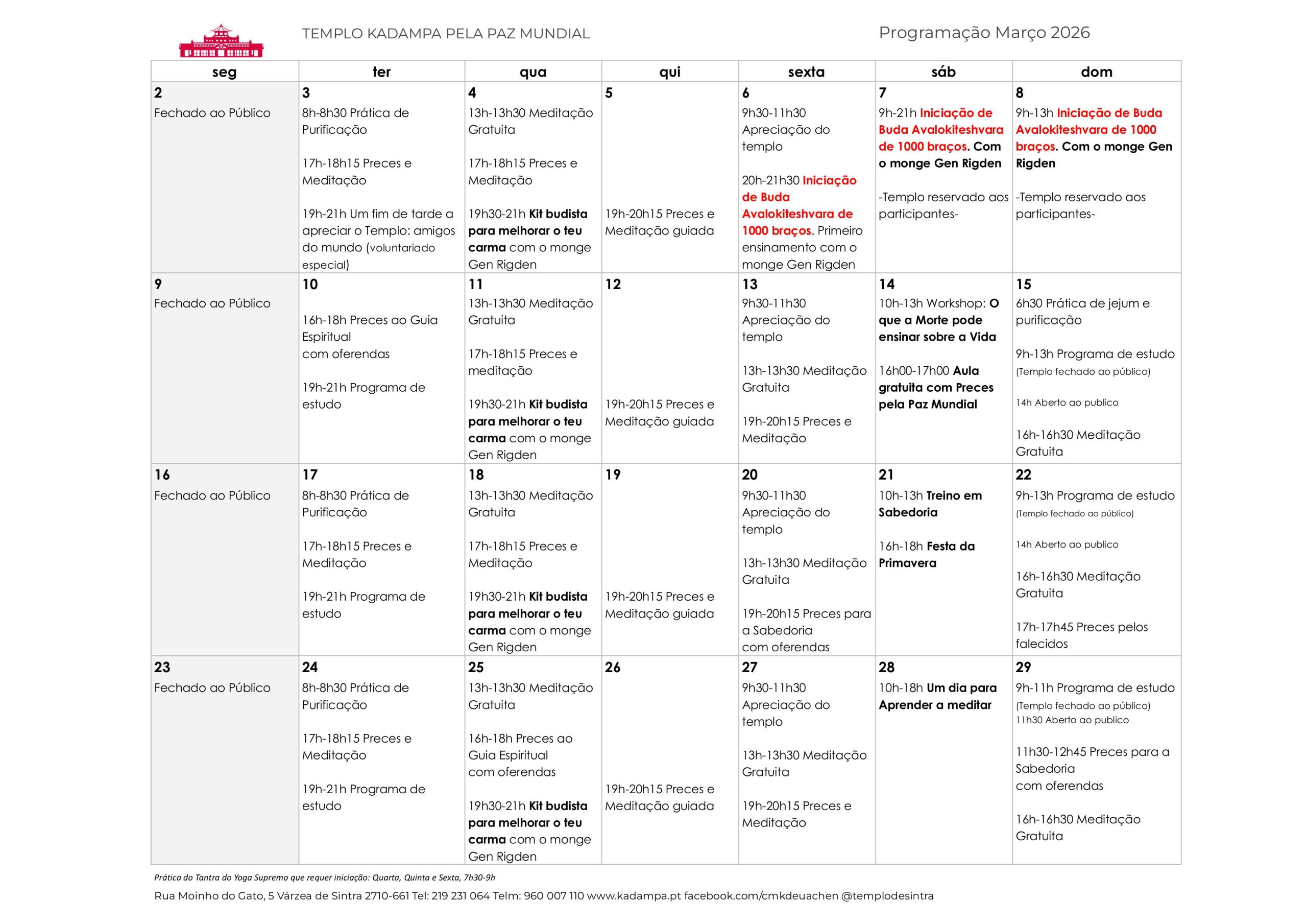 Vem passar um domingo connosco! À tarde, nossas portas estão abertas para todos os que desejam visitar e conhecer o Templo. Às 16h, podes desfrutar de uma meditação guiada gratuita no Templo, mesmo que nunca tenha meditado antes. A atividade é gratuita e não requer inscrição.